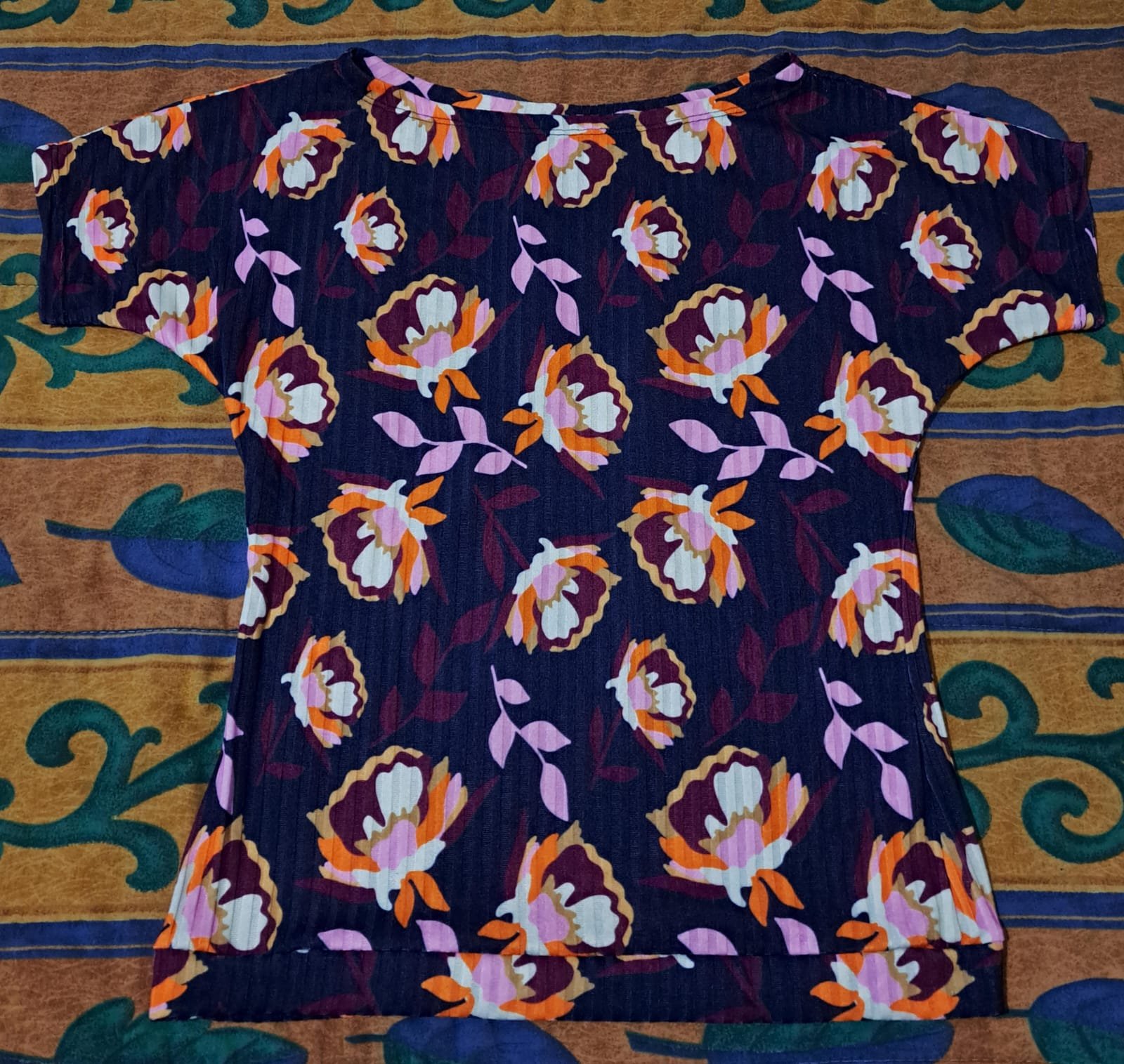 – Diseño: Con sublimado de flores 🌸 en naranja 🟦, rosa 🩷, blanco 🤍 y detalles dorados ✨
